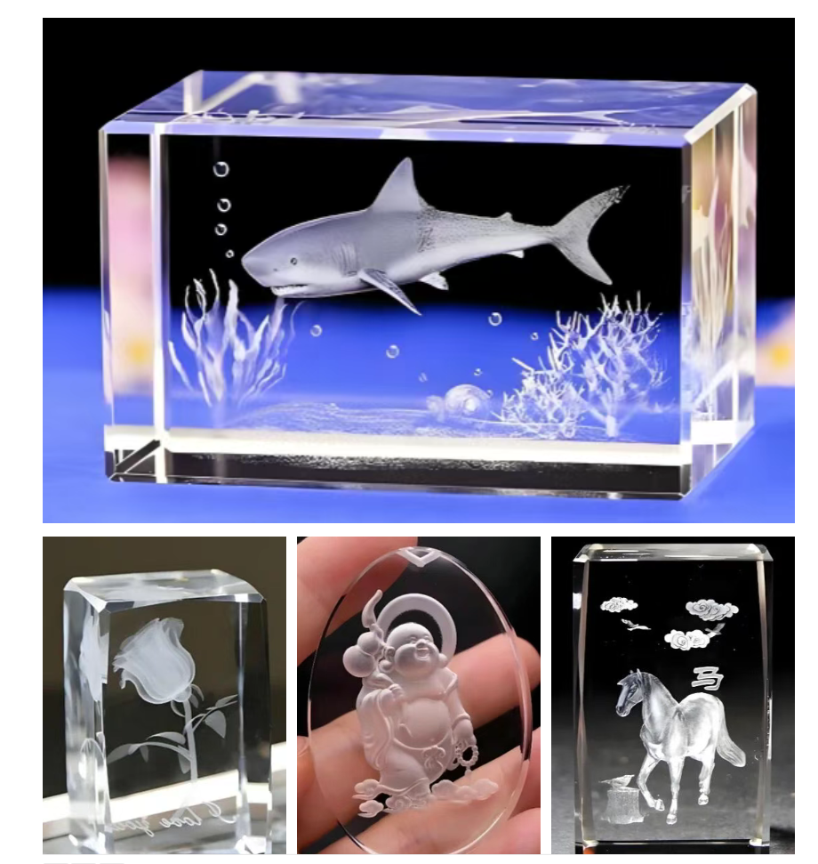 水晶材質硬度高、透明度強,普通雕刻方式要么無法實現內部成型,要么容易劃傷表面、破壞晶體完整性。而激光內雕的核心,是讓激光能量精準聚焦于水晶內部的特定點位,使局部晶體發生微爆裂,形成細膩的白色點陣,最終組合成清晰的立體圖案。這就要求設備必須具備三大核心能力: